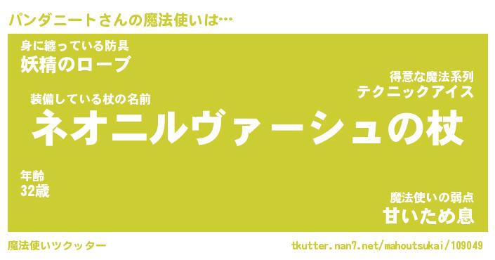 | 男性向けラノベタイトル風あだ名 | 『パンダニートの憂鬱』 |