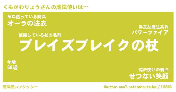 | 男性向けラノベタイトル風あだ名 | 『くもかわりょうの憂鬱』 |
