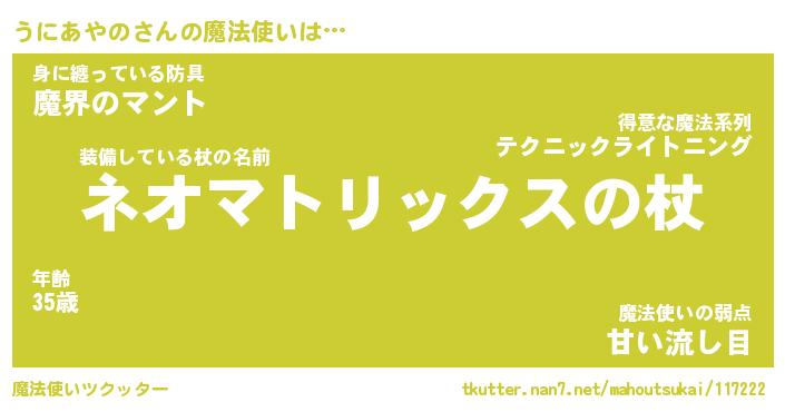 | 男性向けラノベタイトル風あだ名 | 『うにあやのの憂鬱』 |