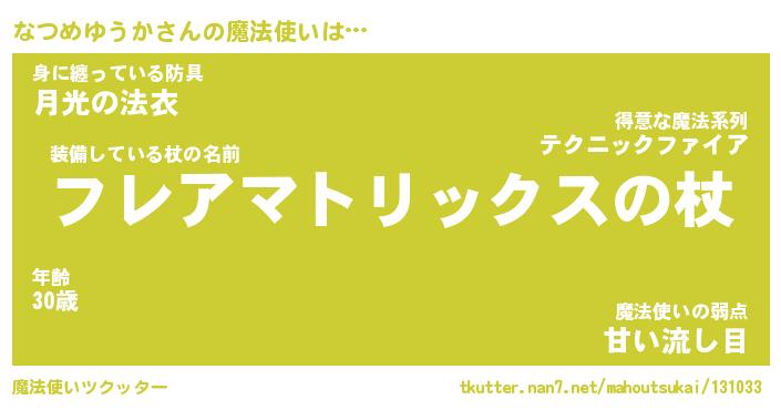 | ヒーロー風カッコイイあだ名 | 『スーパーナツメユウカ』『魔戒騎士ナツ』 |
