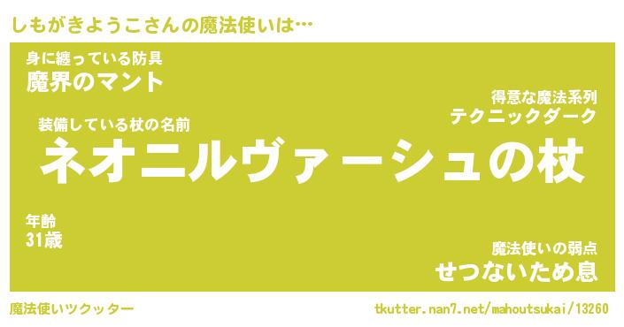 | 肩書あだ名 | 『しもがきようこ御曹司』 |