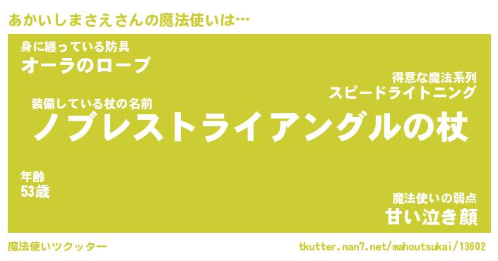 | 男性向けラノベタイトル風あだ名 | 『アカイシマサエアートオンライン』 |