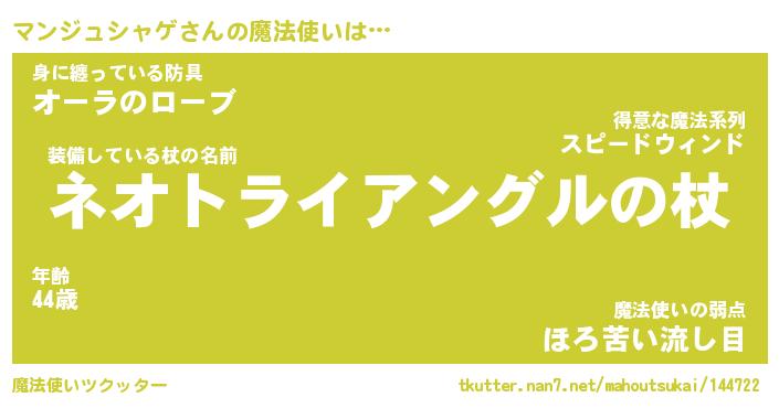 | 女子向けラノベタイトル風あだ名 | 『マンジュシャゲ姫と円卓の騎士』 |