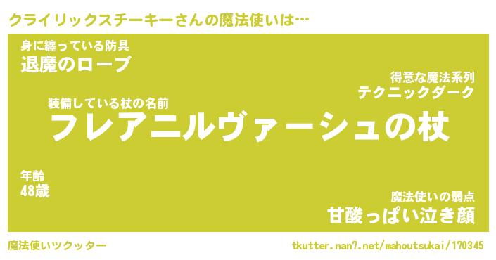 | 男性向けラノベタイトル風あだ名 | 『クライリックスチーキーの憂鬱』 |