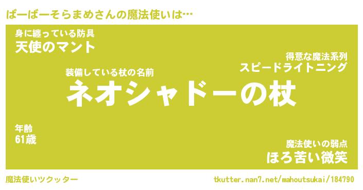 | 男性向けラノベタイトル風あだ名 | 『ばーばーそらまめの憂鬱』 |