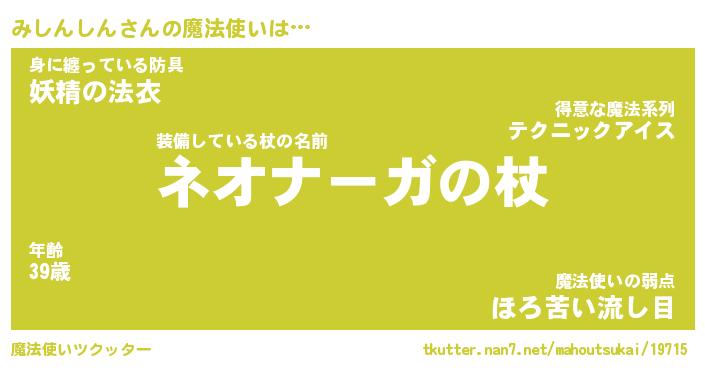 | 男性向けラノベタイトル風あだ名 | 『みしんしんの憂鬱』 |
