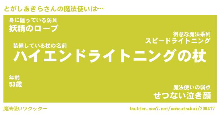 | ヒーロー風カッコイイあだ名 | 『スーパートガシアキラ』『魔戒騎士トガ』 |