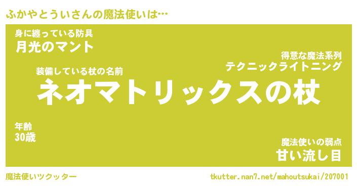 | ヒーロー風カッコイイあだ名 | 『スーパーフカヤトウイ』『魔戒騎士フカ』 |