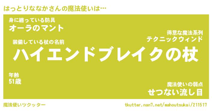 | 男性向けラノベタイトル風あだ名 | 『ハットリナナカアートオンライン』 |