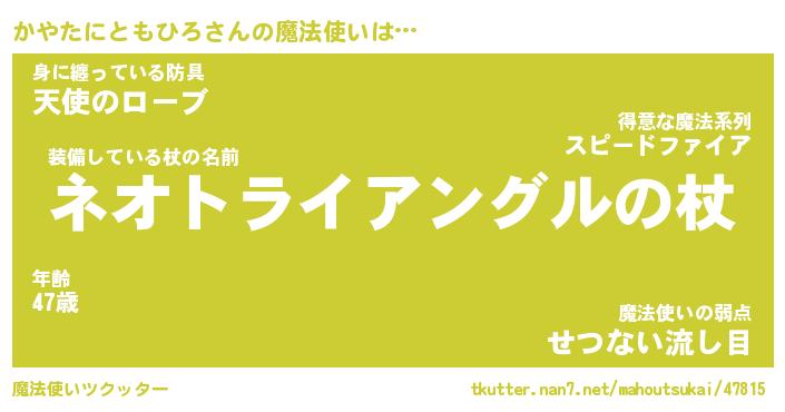 | 胡散臭い通販商品みたいなあだ名 | 『モテモテ間違いなし霊験あらたかなお札…その名も「かやたにともひろ」』 |