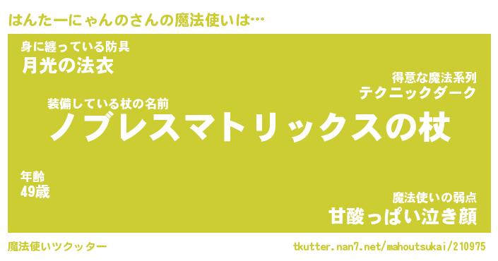 | 男性向けラノベタイトル風あだ名 | 『ハンターニャンノアートオンライン』 |