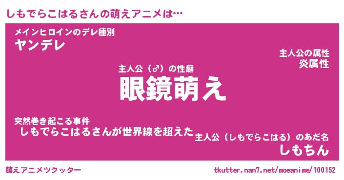 | 男性向けラノベタイトル風あだ名 | 『しもでらこはるの憂鬱』 |