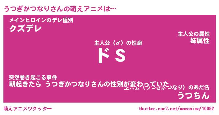 | 男性向けラノベタイトル風あだ名 | 『うつぎかつなりの憂鬱』 |