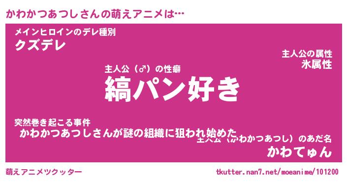 | 女子向けラノベタイトル風あだ名 | 『(仮)かわかつあつしのやんごとなき事情』 |
