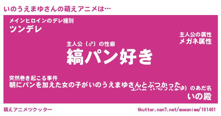 | 女子向けラノベタイトル風あだ名 | 『(仮)いのうえまゆのやんごとなき事情』 |