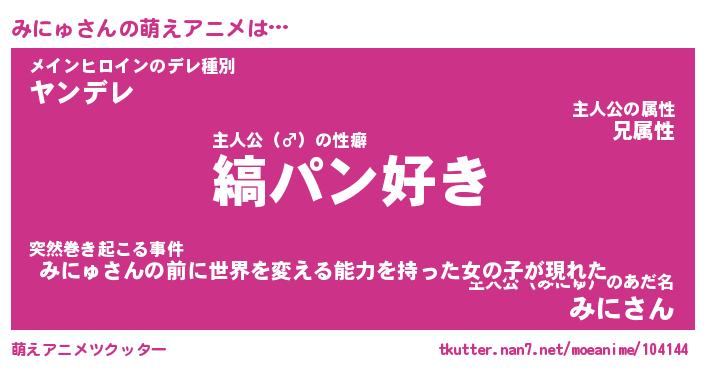 | 男性向けラノベタイトル風あだ名 | 『みにゅの憂鬱』 |