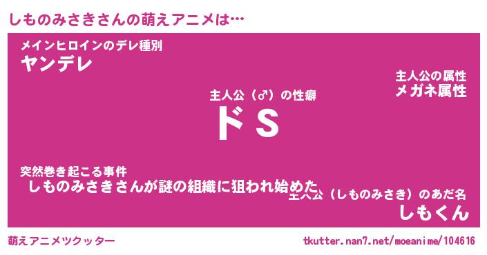 | 男性向けラノベタイトル風あだ名 | 『しものみさきの憂鬱』 |