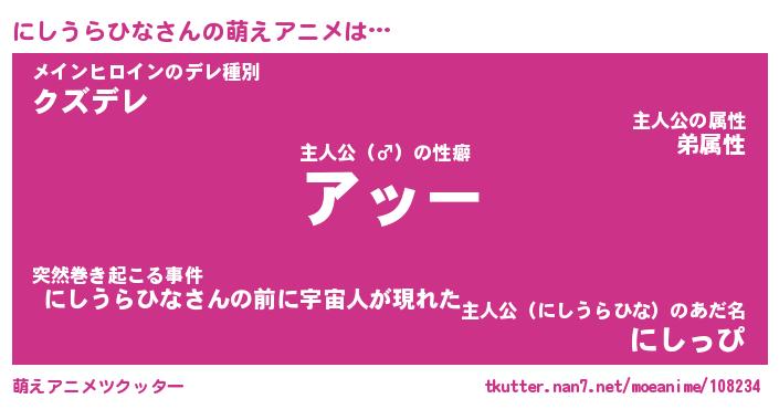 | 男性向けラノベタイトル風あだ名 | 『ニシウラヒナアートオンライン』 |