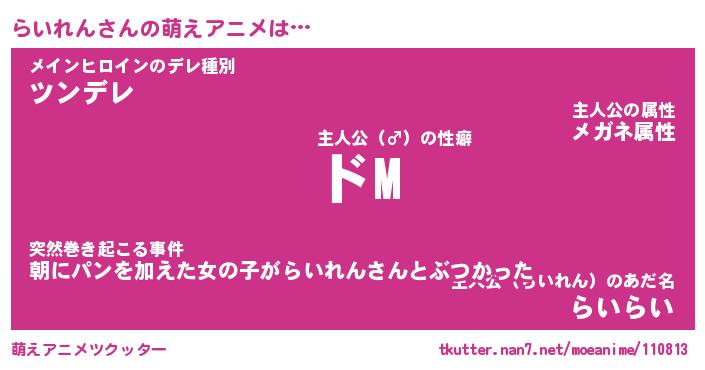 | 男性向けラノベタイトル風あだ名 | 『らいれんの憂鬱』 |