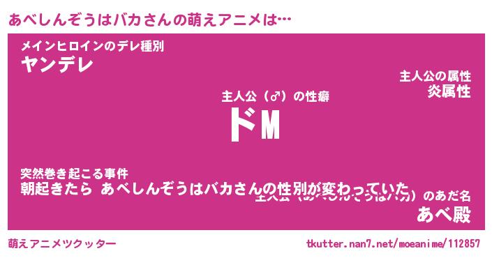 | 男性向けラノベタイトル風あだ名 | 『あべしんぞうはバカの憂鬱』 |