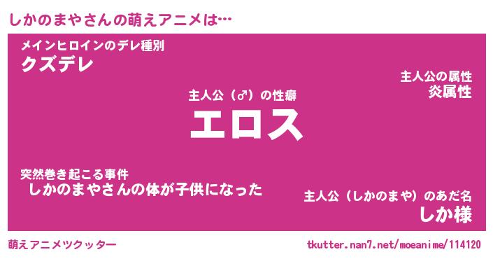 | 男性向けラノベタイトル風あだ名 | 『シカノマヤアートオンライン』 |