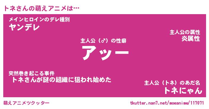| 男性向けラノベタイトル風あだ名 | 『トネアートオンライン』 |