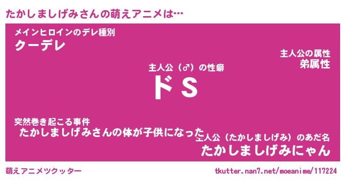 | 女子向けラノベタイトル風あだ名 | 『(仮)たかしましげみのやんごとなき事情』 |