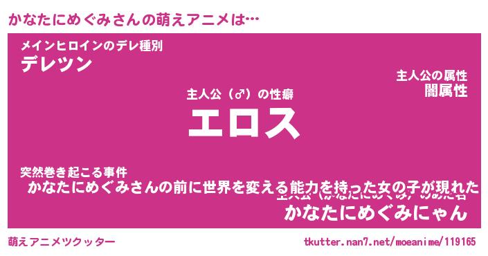 | 男性向けラノベタイトル風あだ名 | 『カナタニメグミアートオンライン』 |