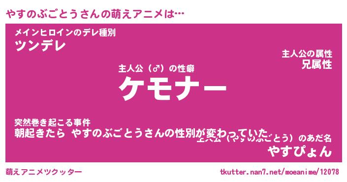 | 女子向けラノベタイトル風あだ名 | 『誰かこのやすのぶごとうを説明してください! ~契約から始まるウェディング~』 |