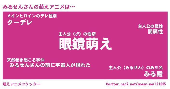 | 男性向けラノベタイトル風あだ名 | 『みるせんの憂鬱』 |