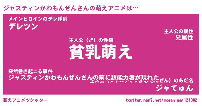 | 男性向けラノベタイトル風あだ名 | 『ジャスティンかわもんぜんの憂鬱』 |