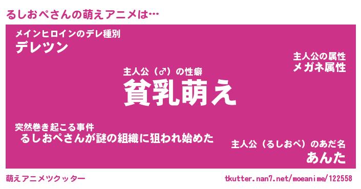 | 男性向けラノベタイトル風あだ名 | 『るしおぺの憂鬱』 |