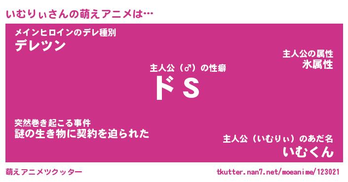 | 男性向けラノベタイトル風あだ名 | 『いむりぃの憂鬱』 |