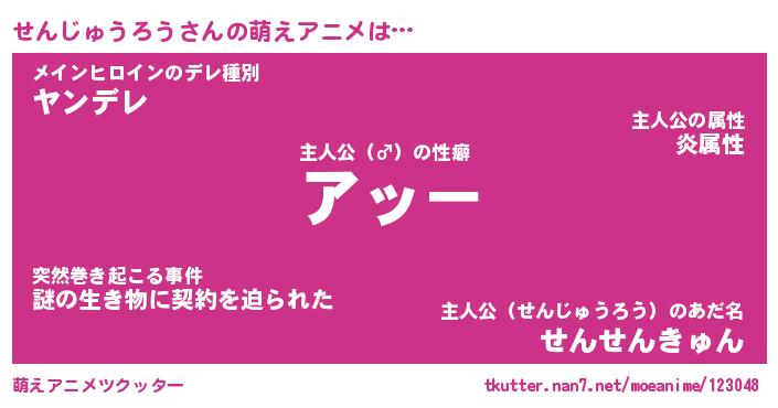 | 女子向けラノベタイトル風あだ名 | 『誰かこのせんじゅうろうを説明してください! ~契約から始まるウェディング~』 |