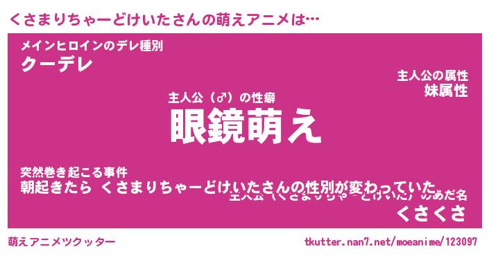 | 男性向けラノベタイトル風あだ名 | 『くさまりちゃーどけいたの憂鬱』 |