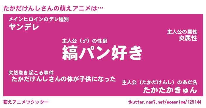 | 女子向けラノベタイトル風あだ名 | 『(仮)たかだけんしのやんごとなき事情』 |