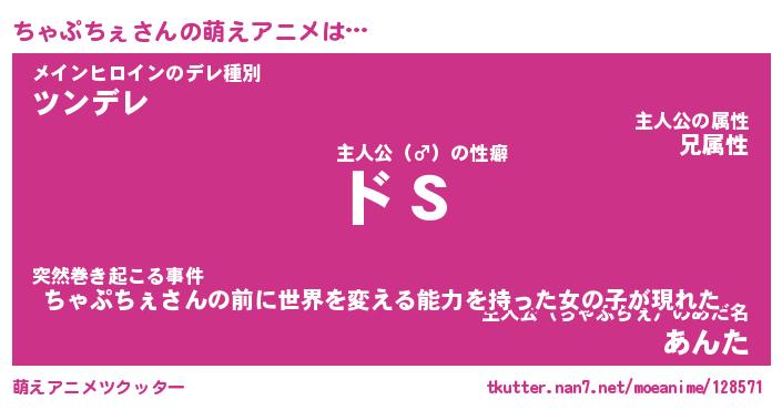 | 男性向けラノベタイトル風あだ名 | 『ちゃぷちぇの憂鬱』 |