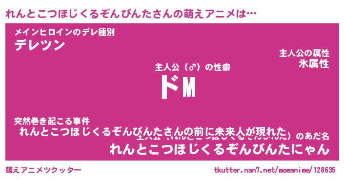 | 男性向けラノベタイトル風あだ名 | 『れんとこつほじくるぞんびんたの憂鬱』 |