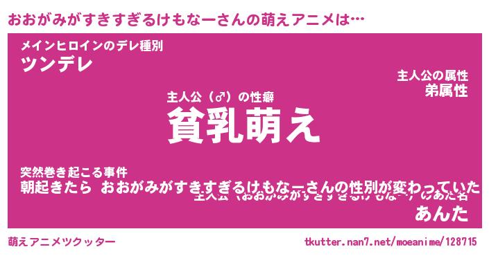 | 男性向けラノベタイトル風あだ名 | 『おおがみがすきすぎるけもなーの憂鬱』 |