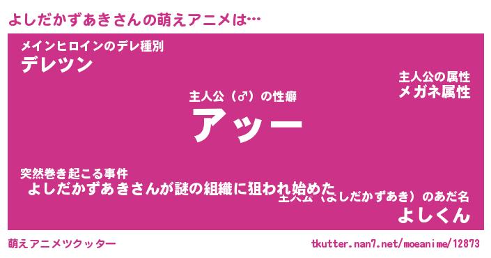 | 男性向けラノベタイトル風あだ名 | 『ヨシダカズアキアートオンライン』 |