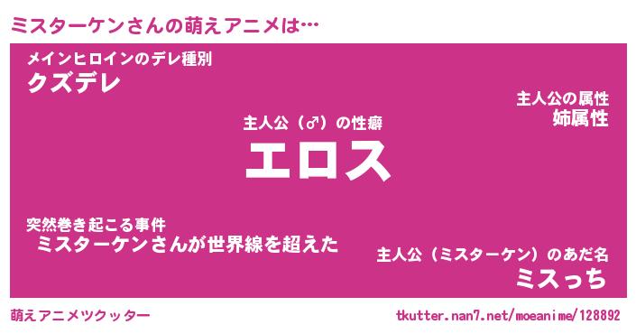 | 女子向けラノベタイトル風あだ名 | 『誰かこのミスターケンを説明してください! ~契約から始まるウェディング~』 |