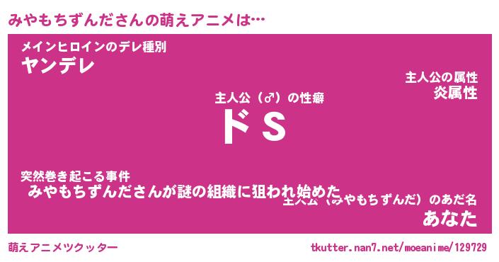 | 男性向けラノベタイトル風あだ名 | 『みやもちずんだの憂鬱』 |