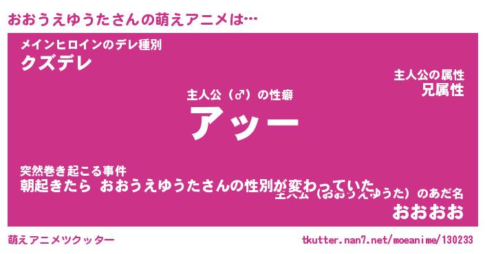 | 男性向けラノベタイトル風あだ名 | 『オオウエユウタアートオンライン』 |
