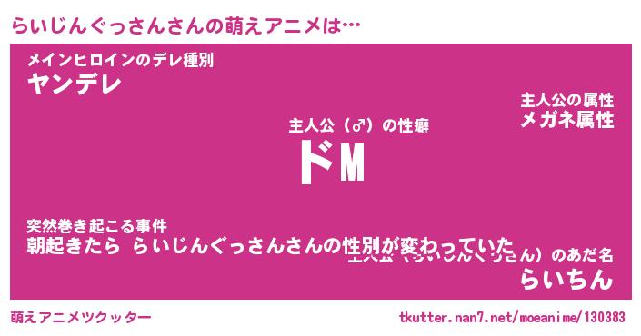 | 男性向けラノベタイトル風あだ名 | 『らいじんぐっさんの憂鬱』 |