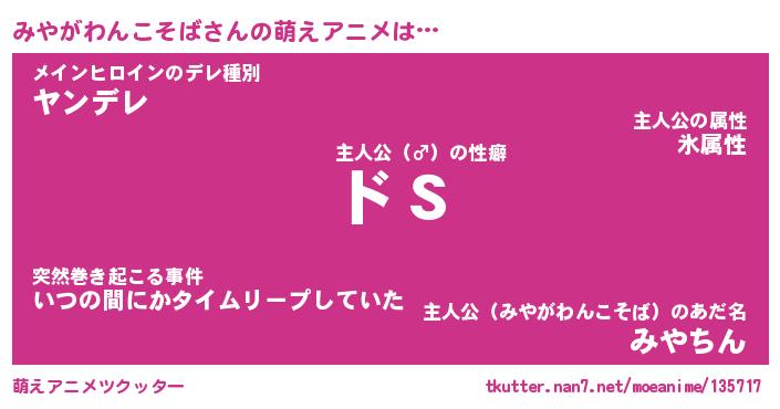 | 男性向けラノベタイトル風あだ名 | 『みやがわんこそばの憂鬱』 |