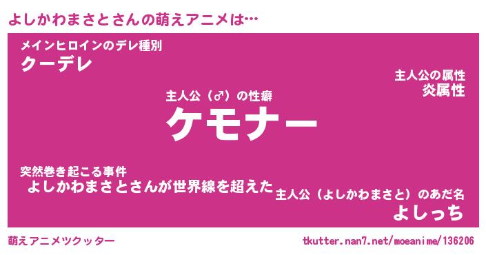 | 女子向けラノベタイトル風あだ名 | 『誰かこのよしかわまさとを説明してください! ~契約から始まるウェディング~』 |