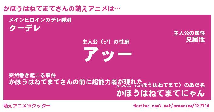 | 男性向けラノベタイトル風あだ名 | 『カホウハネテマテアートオンライン』 |