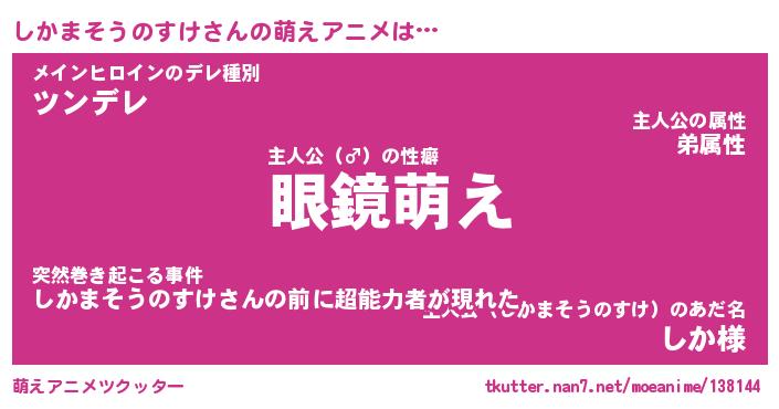 | 男性向けラノベタイトル風あだ名 | 『しかまそうのすけの憂鬱』 |