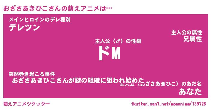 | 女子向けラノベタイトル風あだ名 | 『(仮)おざさあきひこのやんごとなき事情』 |