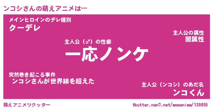 | 男性向けラノベタイトル風あだ名 | 『ンコシアートオンライン』 |
